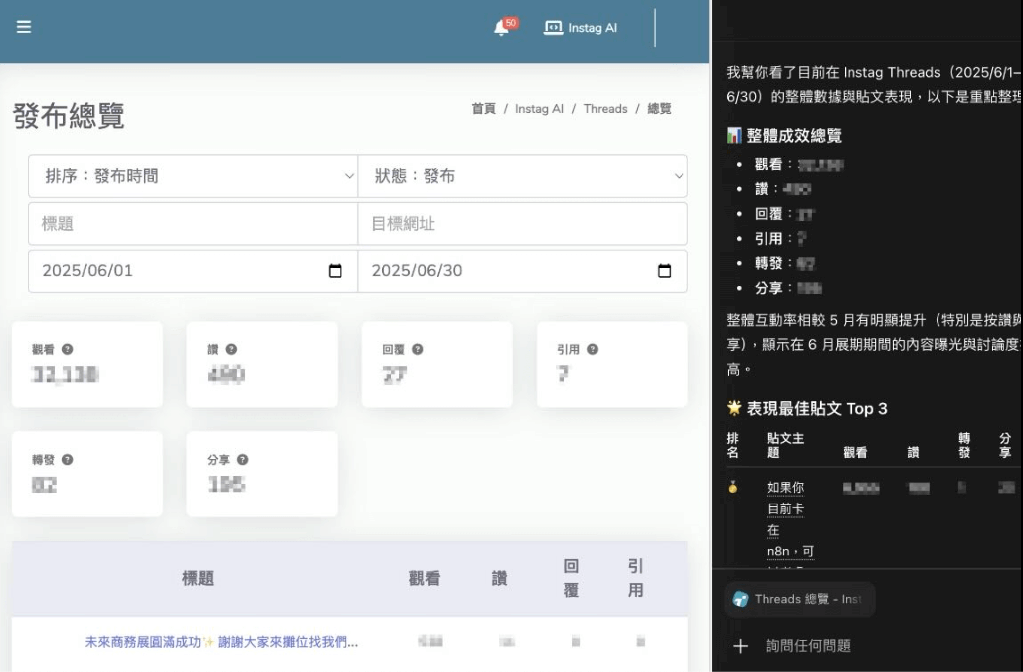 - 統一後台呈現與任務交付:所有整合後的資料都可以在 Instag 的後台統一查看、追蹤與管理,支援圖表呈現、歷史比對與追蹤儀表板,並可進一步:
