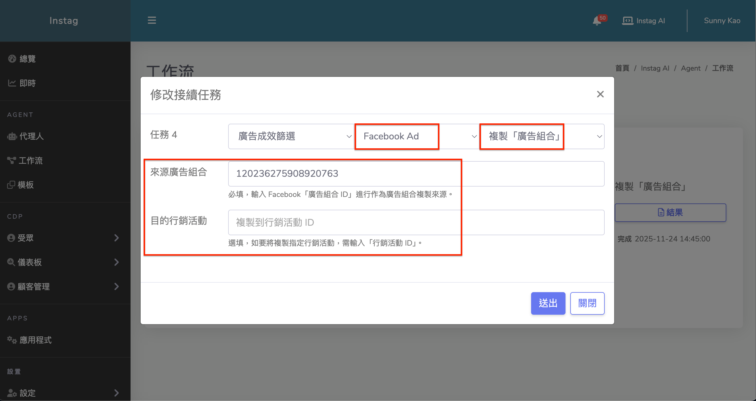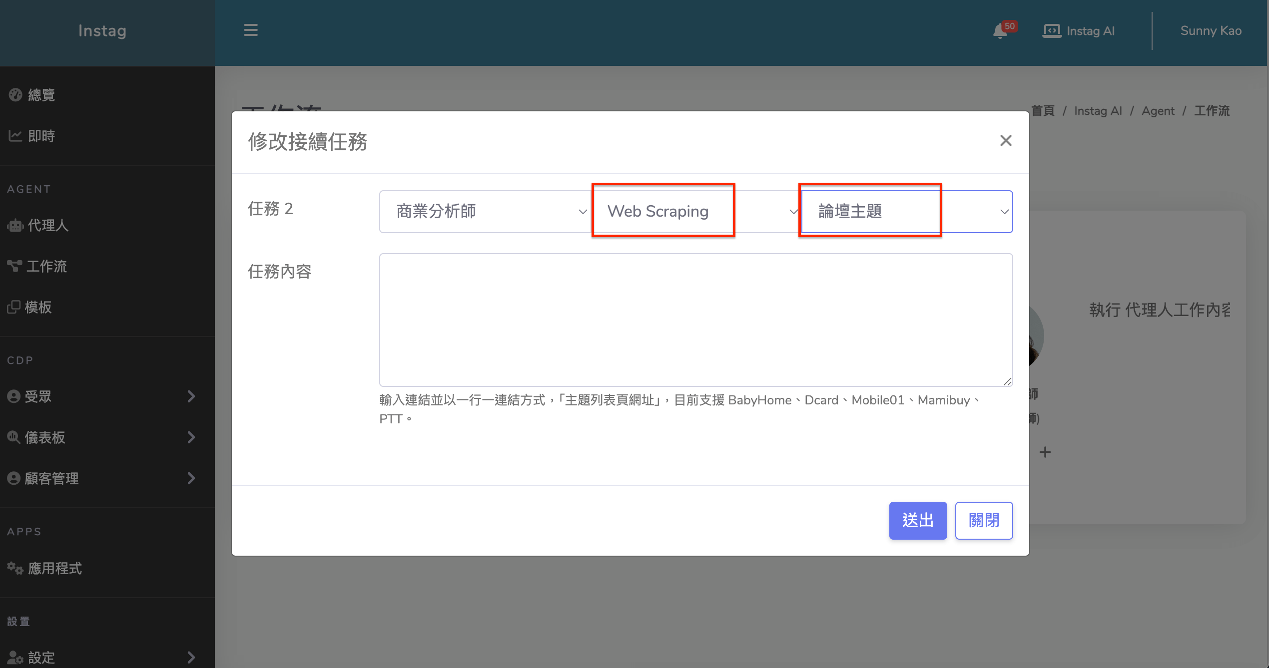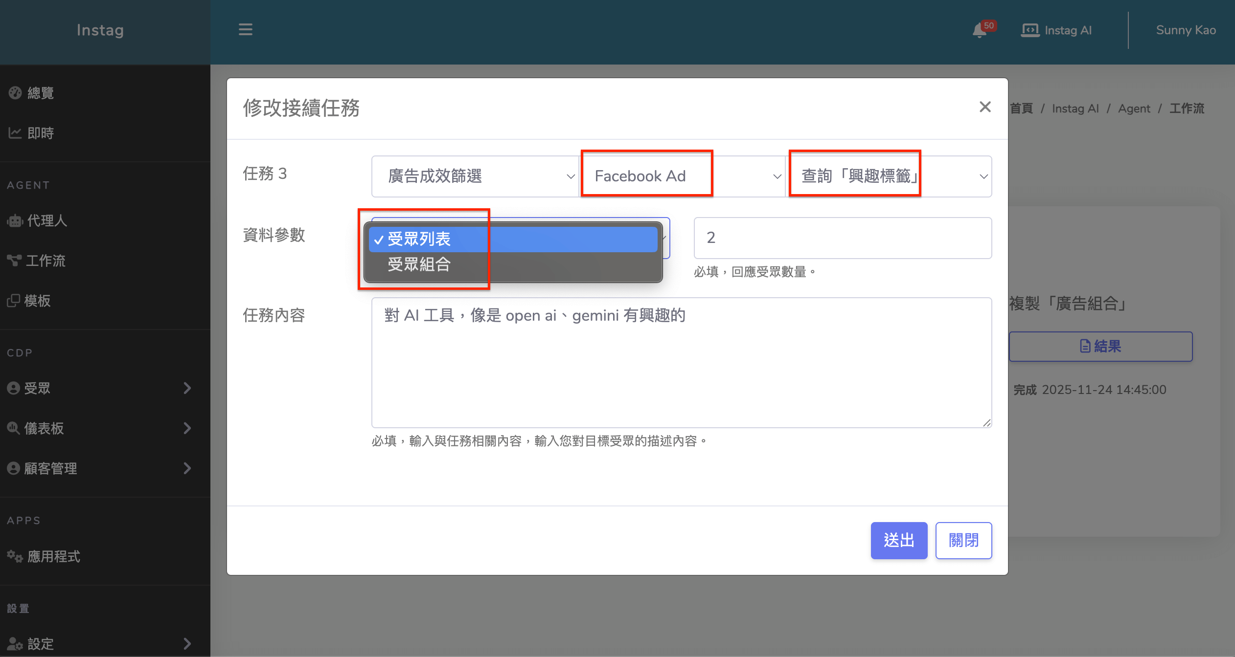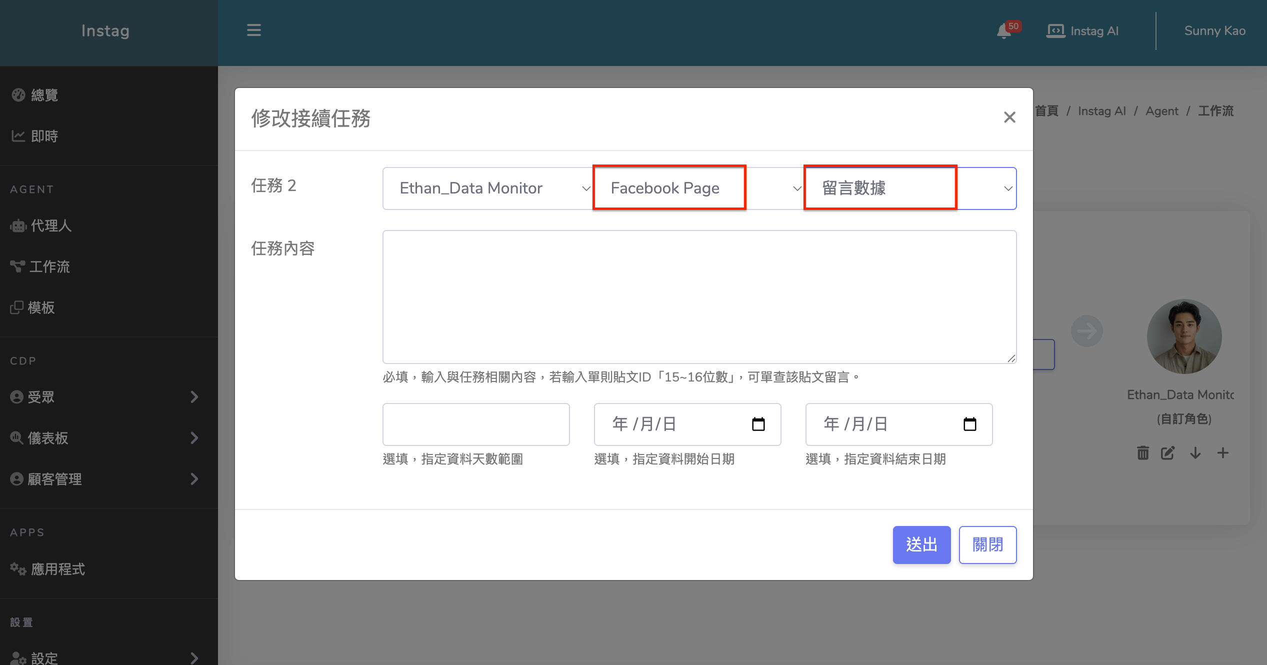 我們新增了「Facebook 留言查詢」任務,讓 Agent 能自動整理自家粉專或貼文底下的留言內容。只需輸入粉專或貼文 ID,Agent 就能快速擷取留言並統一整理,省下逐條查看的時間,也避免遺漏重要回覆。