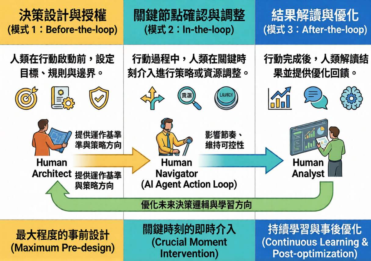 在 AI 代理開始承接實際行動的情境下,人類的參與方式需要被具體設計,而非停留在抽象概念中。有效的人機協作,來自於人類判斷在不同決策階段被安置在合適的位置,使系統在推進任務時保有方向感與可控性。