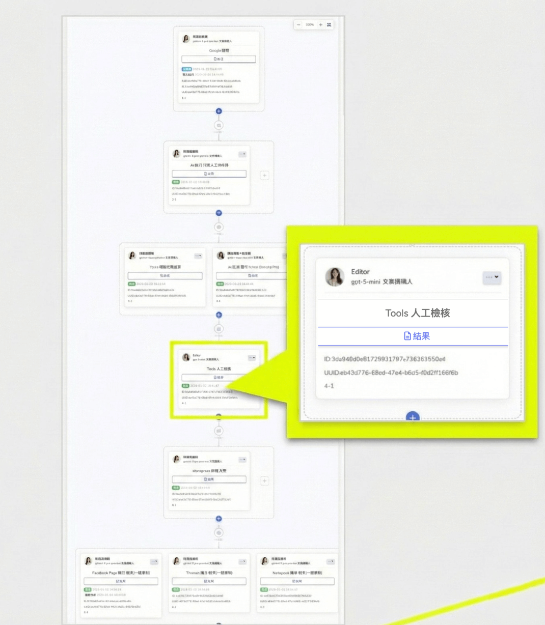 在任務層級,Instag 採用畫布式流程呈現方式,將 AI 代理的行動拆解為明確的步驟與關係。使用者能直接掌握任務的組成方式、觸發條件與目前狀態,使流程運作具備可視性,也能在需要時進行調整。