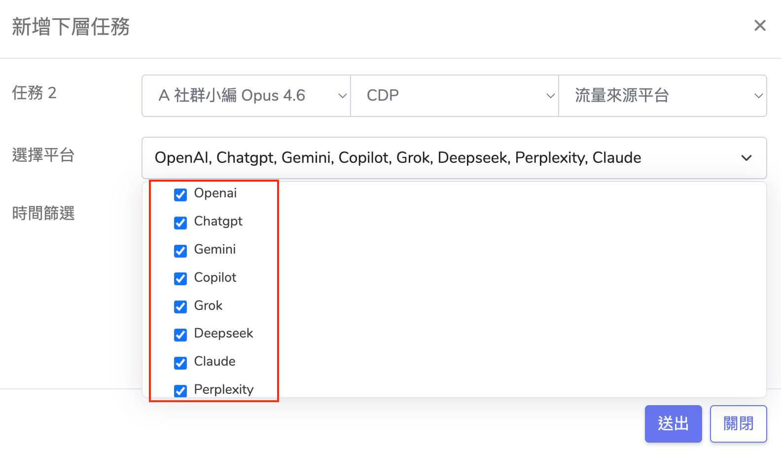 本月更新重點:Threads 任務排序與搜尋紀錄、Google 關鍵字熱度趨勢分析、跨平台數據匯出至 Google Sheets、AI 流量來源辨識、聯絡人匯入匯出紀錄管理,以及新版總覽與模型升級支援。