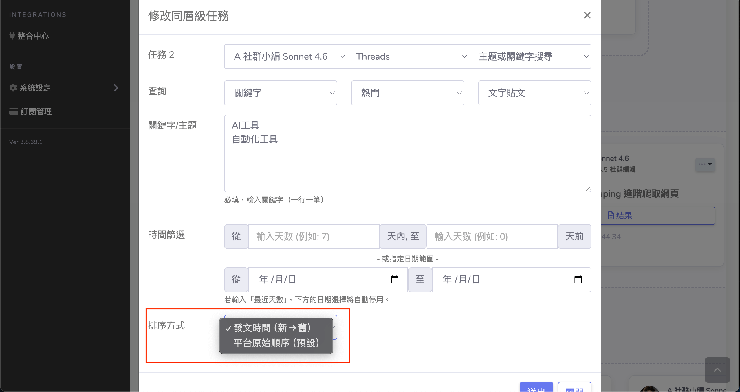 在 Threads 搜尋任務中,現在可以自訂輸出結果的排序邏輯。