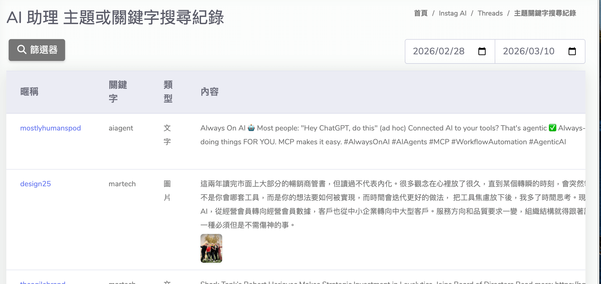當你使用 Agent 查詢 Threads 主題或關鍵字時,系統會自動保留搜尋紀錄